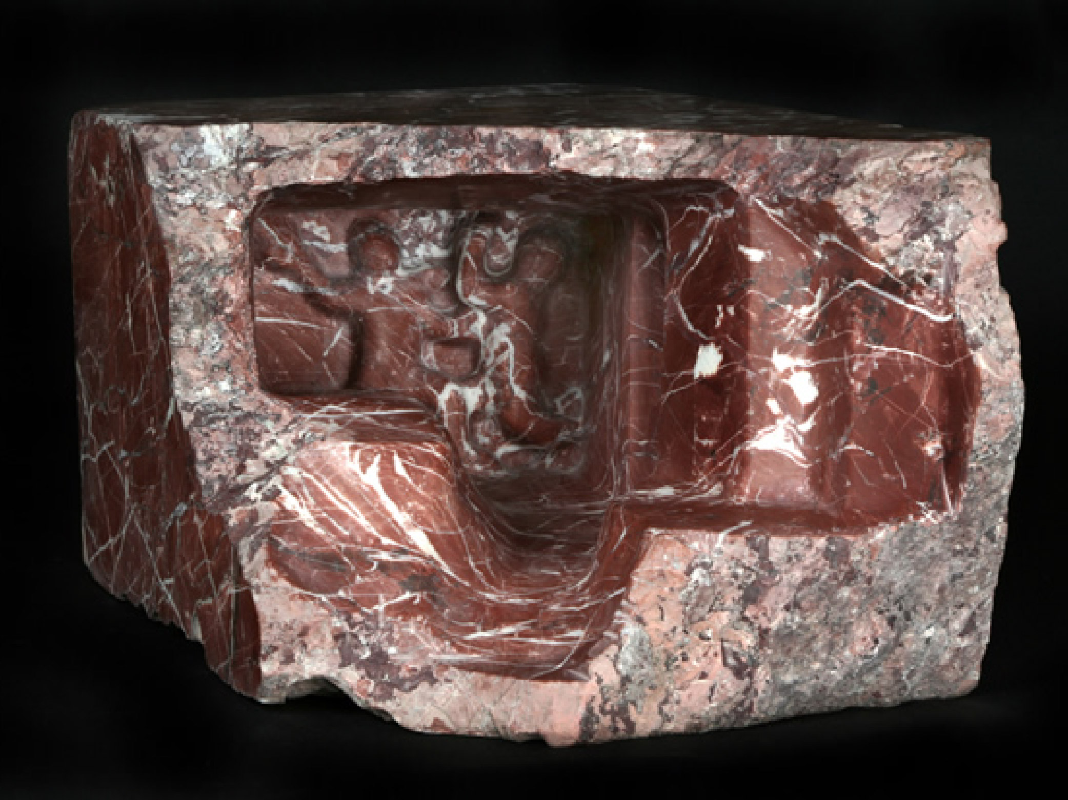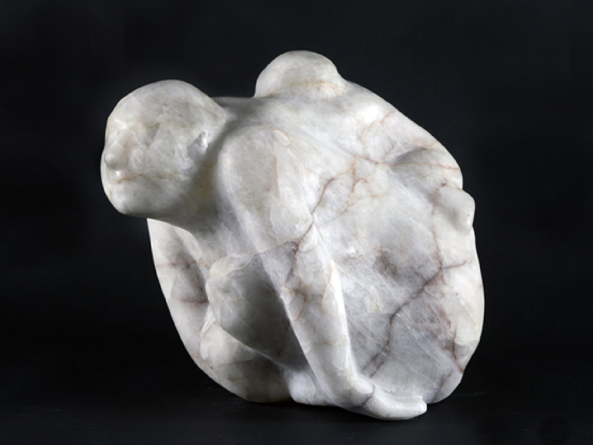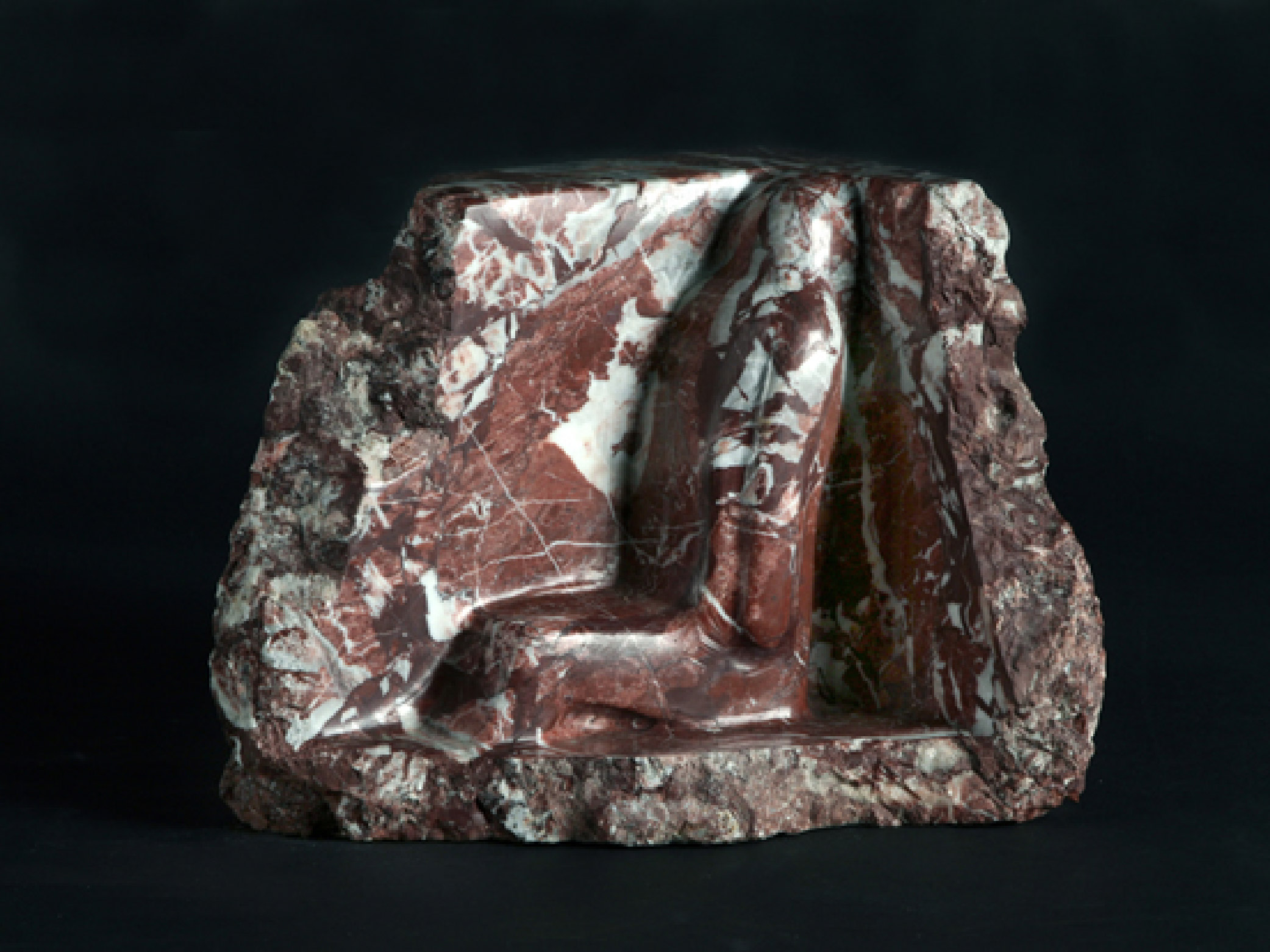 ENG What matters is that the exhibition takes place in a home. A home is the natural environment for Jolanta Wołocznik’s sculptures. The artist has never denied this; in fact, she has occasionally mentioned how, while carving stone, she reflects on how easily her works adapt to any interior. The strategy of creating sculptures that are compatible with the architecture of an apartment naturally influences their scale and form—Wołocznik often synthesizes or even completely flattens parts of her pieces, clearly suggesting their fit with walls, furniture, or corners of a room. In this case, however, thinking about interiors has a dual significance: it is not limited solely to the optimal placement of the works, but also relates to their content. Each sculpture, in a more or less literal way, speaks of hidden, unexpressed emotions that every person carries within themselves. An example of a sculpture’s relationship with its location is Dywanik 1 (Rug 1). The work was shown in a location of particular significance to the Broniewskis—the bed of their beloved dog, Łepek. Long after Łepek’s death, as well as that of his owners, his bed remained untouched for years. Dywanik 1 is a curled-up figure, carved from marble and placed in the corner where Łepek used to lie, evoking the sense of absence that accompanied the former household members. Perhaps out of habit, perhaps simply due to human longing, the Broniewskis could not part with their pet’s bed, which today forms part of the museum’s scenography.